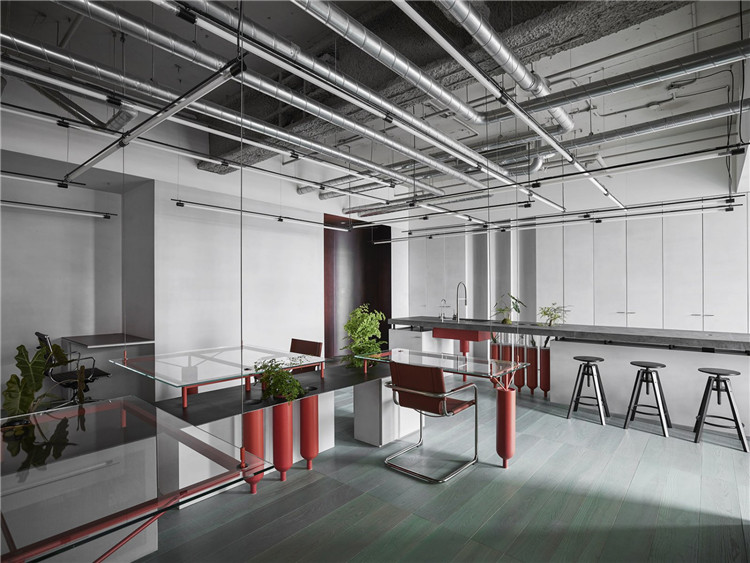 當靈感關鍵抓緊"科學"而非"辦公室",設計師希望強化產業屬性里的科學基底,扭轉一般人對辦公室的刻板藍圖.回歸產品本身最貼近的實驗室、工廠環境,日日可見的試管、生鐵黑鐵、氣體輸送管,以及包裝承載科技氣體的獨特鋼瓶,擷取生產鏈上再熟悉不過的材質與造型,拆解轉換成辦公空間的結構形體.