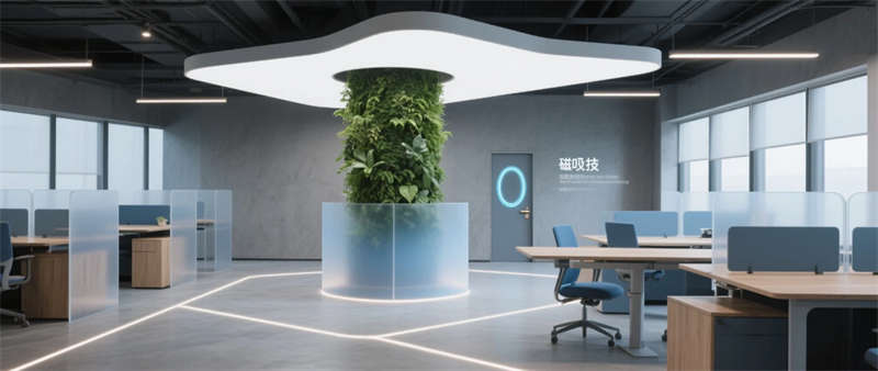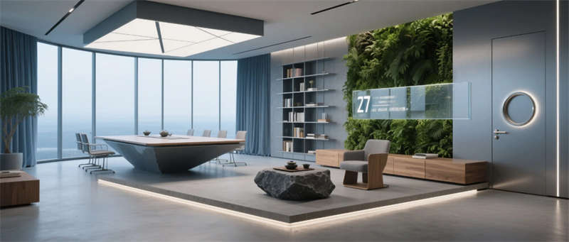入口大廳以8米寬LED弧形屏呈現(xiàn)動(dòng)態(tài)視覺沖擊,懸浮曲面黑巖板前臺與天花垂墜的3D打印樹脂裝置形成虛實(shí)對話;開放式辦公區(qū)通過模塊化磁吸工位與中央綠植柱,實(shí)現(xiàn)靈活協(xié)作與生態(tài)療愈的平衡;總裁辦公室270°全景落地窗搭配懸浮會議島,幾何切割天花與火山石茶臺演繹力量與自然的共生哲學(xué)。