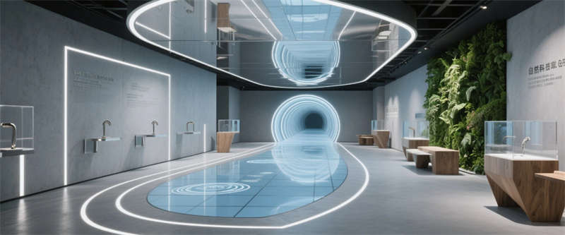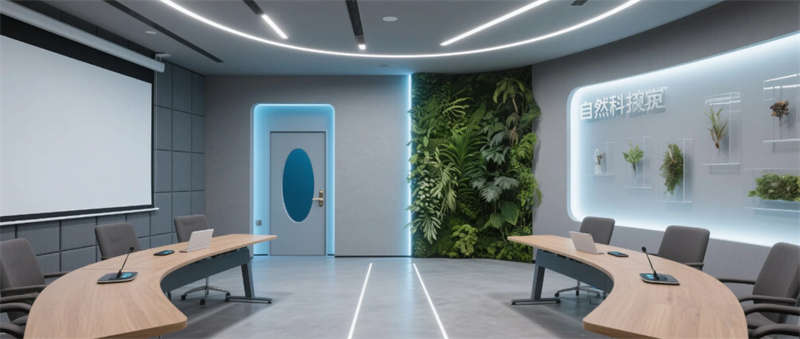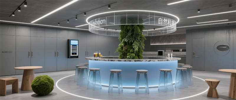 各區(qū)域通過四大統(tǒng)一性語言緊密串聯(lián):霧霾藍(lán)橢圓金屬門把手貫穿全空間,再生材料家具呼應(yīng)可持續(xù)發(fā)展理念,聲學(xué)墻面嵌入本地植物標(biāo)本強(qiáng)化生態(tài)屬性,智能燈光系統(tǒng)則通過4000K色溫線性燈帶實(shí)現(xiàn)晝夜場景的無縫切換。特別設(shè)計(jì)的全息投影展廳智能階梯會議室,通過LED交互地屏與AR懸浮展臺,將品牌科技基因融入空間體驗(yàn)。