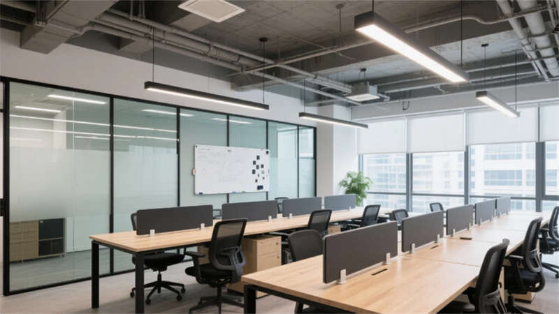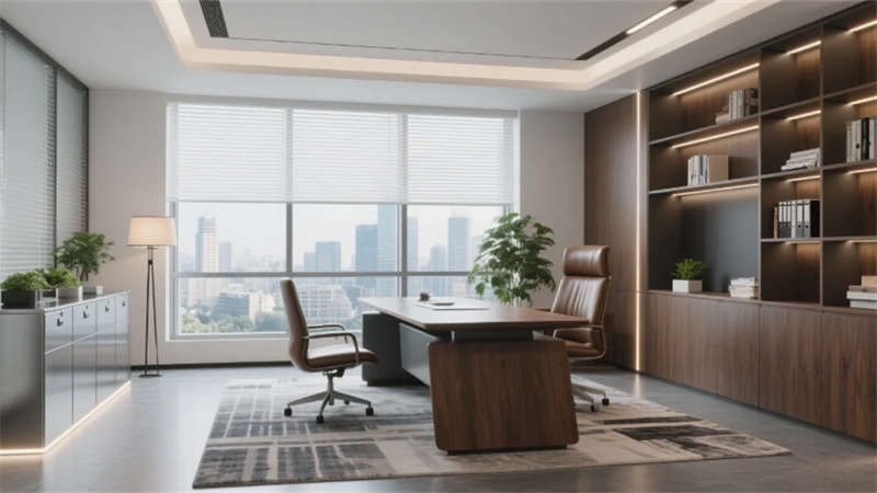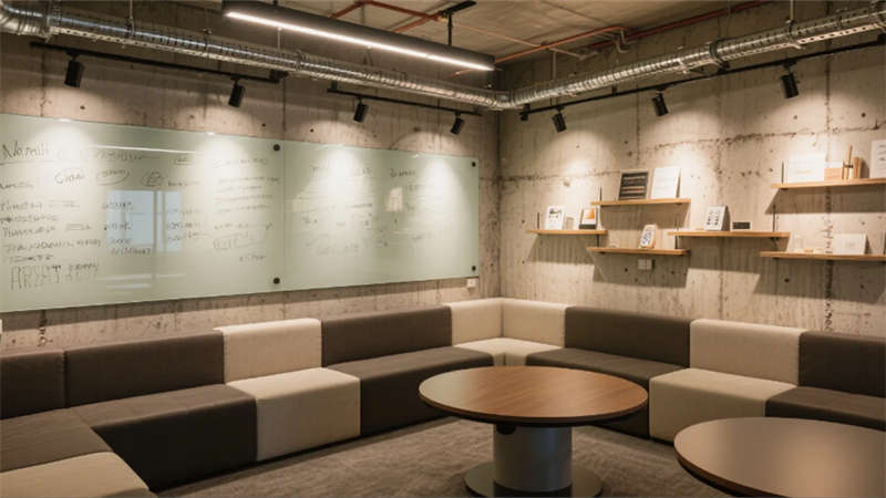 從前臺懸浮木紋臺面的企業(yè)標識,到開放式工位可變的模塊化組合,空間始終保持著“未完成”的進化基因。頭腦風(fēng)暴區(qū)的可書寫玻璃墻記錄著思維軌跡,階梯培訓(xùn)區(qū)的滑軌電源系統(tǒng)隨需求生長,智能會議室霧化玻璃在透明與私密間自由切換,專注電話艙的磨砂質(zhì)感包裹著獨立思考的靜謐。高管辦公室的皮質(zhì)座椅與垂直線條燈帶,隱喻著決策的柔韌與果決,而咖啡區(qū)黑板墻的手繪痕跡,則讓機械齒輪般的空間有了呼吸的節(jié)奏。