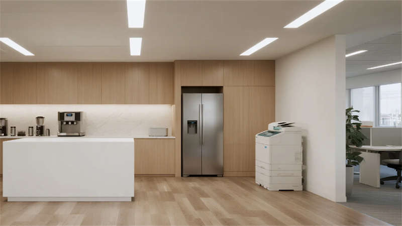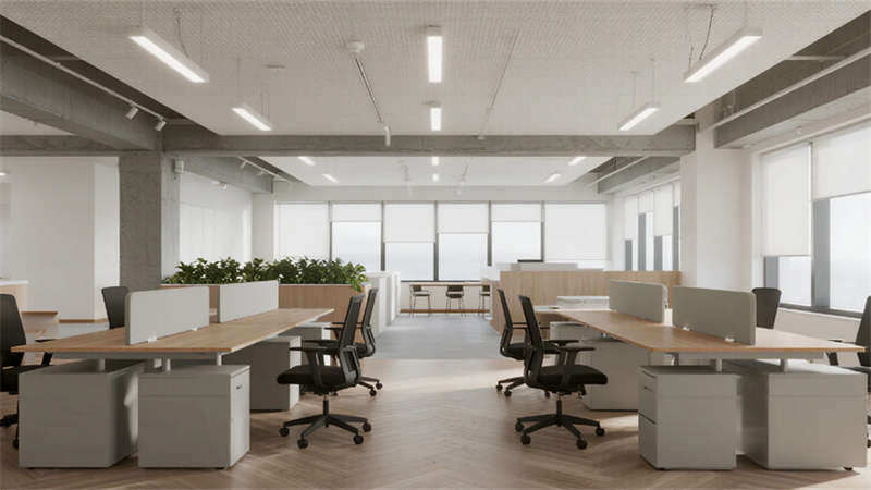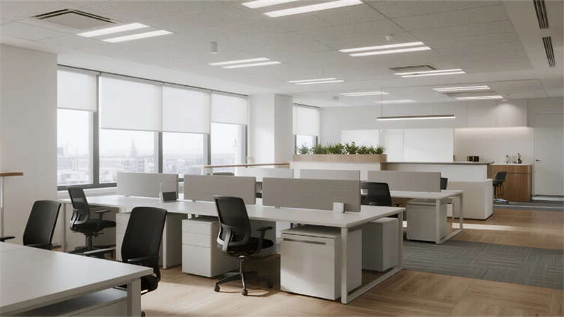 內部空間延續外部的純凈氣質。企業大堂以淺白色大理石地面與溫潤木紋墻面奠定基調,弧形純白前臺點綴深藍企業標識,懸浮線性燈光延伸視覺。右側等候區模塊化沙發與綠植盆景營造舒適氛圍,左側數字影像墻動態展示企業風采,淺灰肌理漆背景墻在隱藏燈帶映襯下更顯質感。開放式辦公區強調高效與靈活,白色穿孔吸音天花下,淺灰可升降桌與黑色人體工學椅組合排列,協作島與窗邊高吧臺滿足多元需求,淺木紋PVC地面增添自然暖意。高管辦公室運用灰玻隔斷與電動霧化膜保障私密,胡桃木辦公桌、深灰皮質沙發與嵌入式書柜彰顯沉穩,無主燈設計營造專注氛圍。公共支持區模塊化吧臺、淺木紋儲物柜與智能文件柜集成高效服務,細節處的綠植點綴延續生態關懷。整體設計從外至內,以統一的色調、考究的材質與智能化細節,塑造出體現合肥創新精神的智慧辦公新標桿。