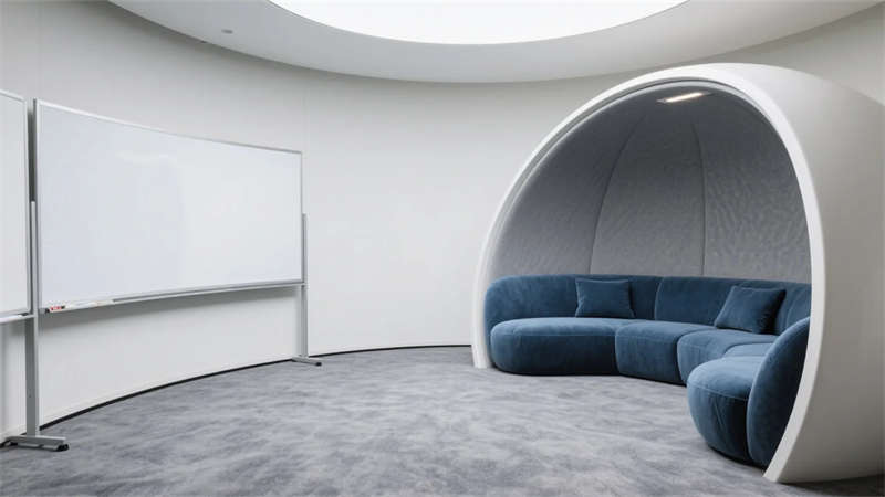 核心區域聚焦功能與美學的平衡:前臺木格柵墻以線性燈光延展空間縱深感;開放式工位區通過綠植與幾何畫作注入生機;獨立辦公室運用胡桃木與皮質元素提升質感,整墻書架成為智慧沉淀的象征。過渡空間被賦予多重價值——走廊生態墻引入自然呼吸,蛋形討論艙激發即興靈感,階梯圖書館則營造沉思角落。