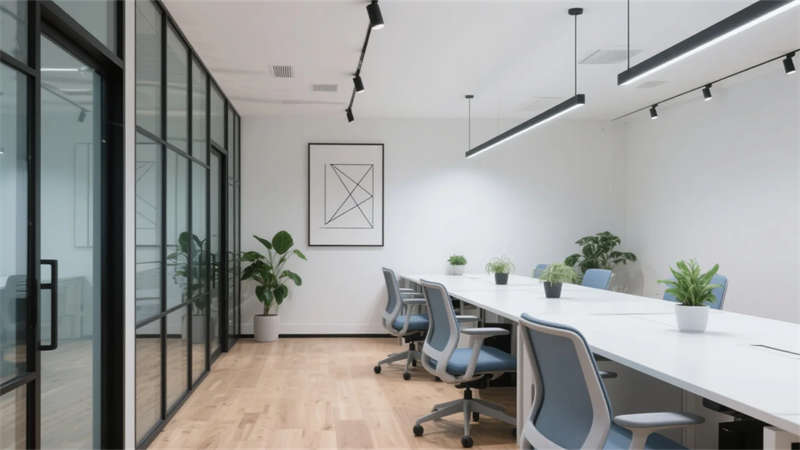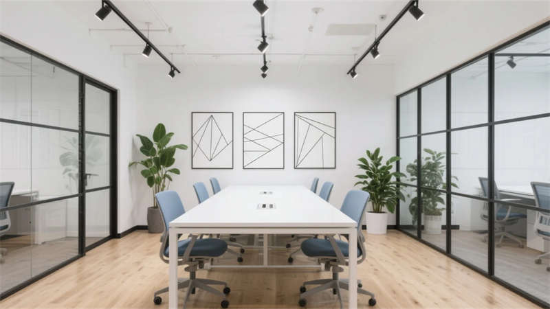 該辦公空間以現代簡約主義為基調,摒棄冗余裝飾,通過材質本真與光影韻律構建理性而溫潤的場域。開放式布局打破傳統隔閡,淺木色地板與純白立面奠定寧靜氛圍,黑色金屬框架勾勒結構張力,形成流動的視覺節奏。