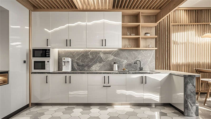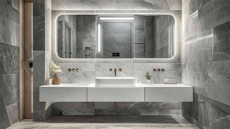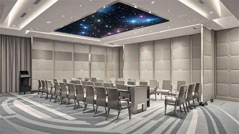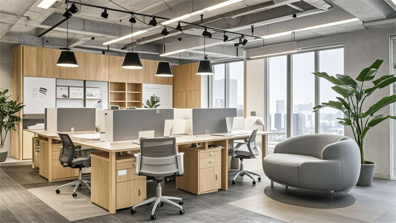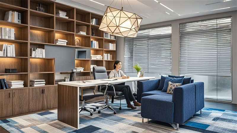 辦公區(qū)采用模塊化布局,配置智能升降桌和人體工學椅,裸頂噴灰工藝結(jié)合軌道燈系統(tǒng)實現(xiàn)靈活照明。色彩體系以高級灰為基底,搭配原木色系緩解視覺壓力,局部采用深藍跳色增強空間層次。材質(zhì)運用注重環(huán)保性能,墻面大量使用穿孔吸音鋁板,地面采用防滑地膠與靜音地毯組合。