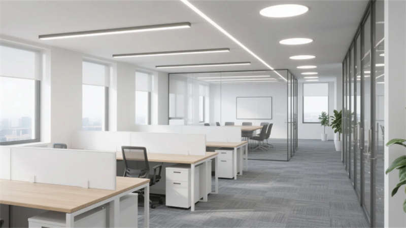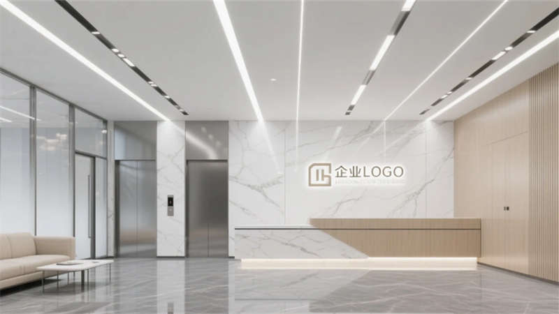 外立面采用橫向分割的玻璃幕墻與淺灰金屬框架,懸挑雨棚與隱藏式燈帶強化幾何美學,夜晚呈現輕盈通透的視覺印象。大堂以白色石材與淺木前臺奠定簡約基調,線性燈帶引導動線,綠植墻與玻璃隔斷休息區平衡商務與休閑氛圍。辦公區通過白色工位隔斷與淺木桌面實現高效布局,線性燈光與落地窗引入充沛自然光,玻璃會議室保障通透視野。