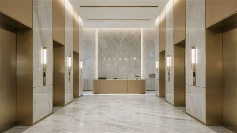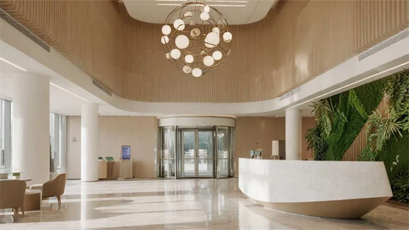 本設(shè)計(jì)以現(xiàn)代簡(jiǎn)約美學(xué)重構(gòu)辦公空間本質(zhì),建筑外觀采用純凈的玻璃幕墻與幾何切割形體,在晝夜交替中演繹光與影的韻律。入口大廳通過挑高空間與弧形前臺(tái)營(yíng)造開放包容的儀式感,綠植墻與球形燈具的點(diǎn)綴賦予空間自然生機(jī)。電梯間延續(xù)極簡(jiǎn)語言,香檳金金屬與巖板材質(zhì)碰撞出低調(diào)質(zhì)感。