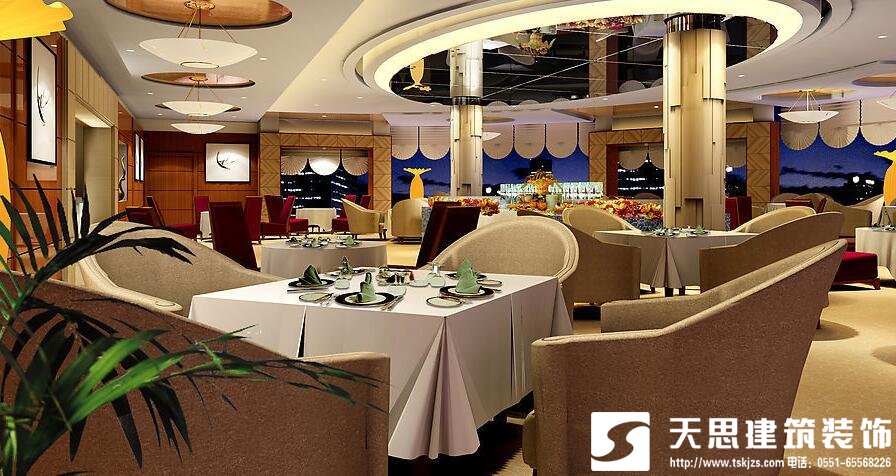 在西餐廳設計過程中,通常吸頂式燈用于天花安裝都緊貼,可增加頂棚亮度,并為餐廳室內提供一般照明和局部照明,為直接采光形式的應用。由于吸頂式燈緊貼于天花,因此由吸頂式燈組成的圖案可 以構成天花的裝飾,裝飾性較強。常見的吸頂式燈具外觀有圓形、方形、三角形、矩形、條形、曲線形等多種幾何形式。燈外透光罩有玻璃、有機玻璃、硬塑等多種材料制成, 形成全透明、半透明、磨砂罩等幾種燈具形式。