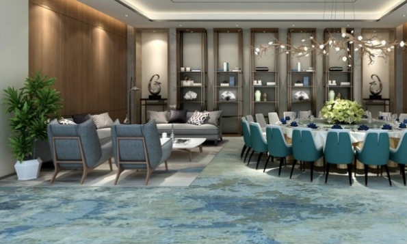 主體的圓形餐桌上懸掛的是一盞仿生吊燈,隨枝干散發開去的白色燈盞猶如悄然開放的花朵,為整個空間提供一種溫馨而典雅的就餐環境。同時,在餐桌椅上大膽地使用了青藍色,熟悉中國畫的人也許一眼就看出了設計的用意:青藍是國畫中較為常見的一種大面積使用的色塊,更常見于山水畫當中。