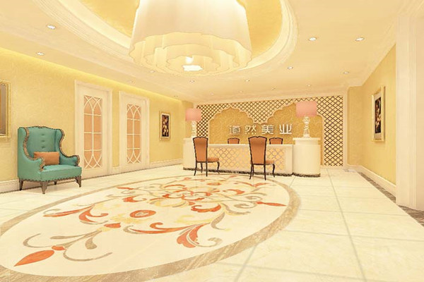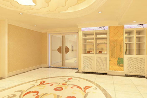 會所大堂采用近幾年比較流行的歐式風格。以淡黃色為主色調,給人以溫馨舒適之感;大廳燈具選用水晶燈池,簡約奢華;墻面則輔以墻紙裝飾,地面則選用色澤飽滿、深色典雅的花崗石。整體突顯歐式古典風格的寧靜和諧。