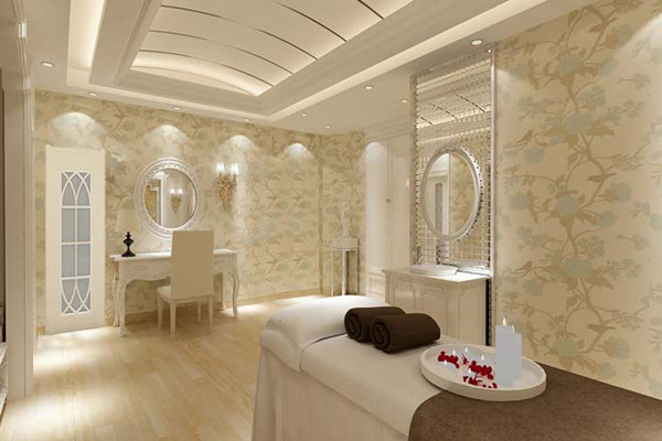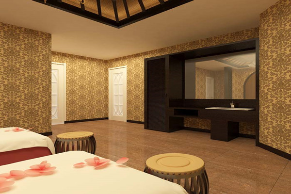 另外東南亞風格的SPA間則采用了較深的木色擦色做漆,并且做了東南亞風格的吊頂。