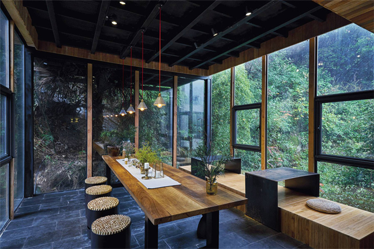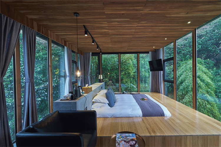 玻璃為墻、為窗,鋼結構吊頂,木色為板,與周圍環境相得益彰,仿佛置身山間之色;睡醒的清晨,清新的空氣迎面而來,拂去懶懶睡意;用山間的寧靜,洗去旅途疲勞,或者城市的浮華與躁動,體味另一番人生心境。