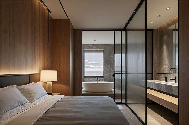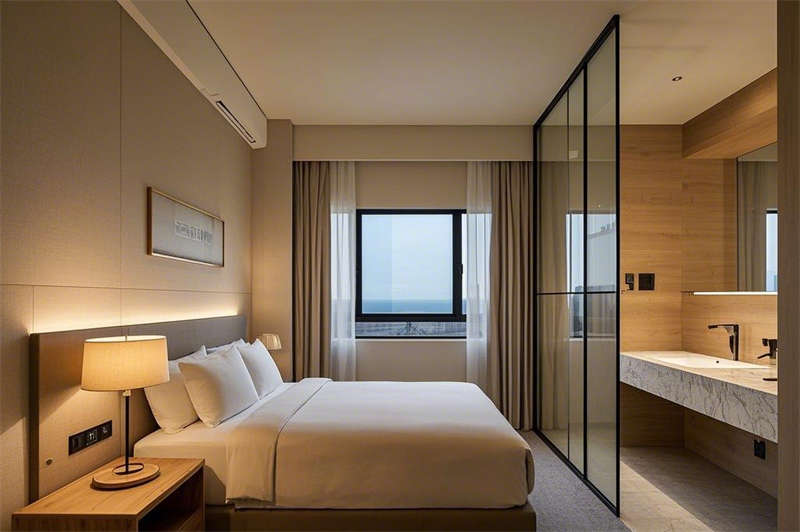 客房設計延續了現代簡約的風格,淺木色與灰色的主色調搭配,營造出寧靜而舒適的居住環境。寬敞的落地窗將城市美景盡收眼底,智能燈光系統與電動窗簾為您提供便捷的入住體驗。干濕分離的衛生間采用大理石臺面與玻璃隔斷,既實用又彰顯品質,讓您在繁忙的旅途中也能享受片刻的放松。