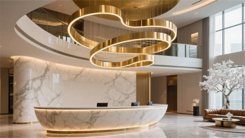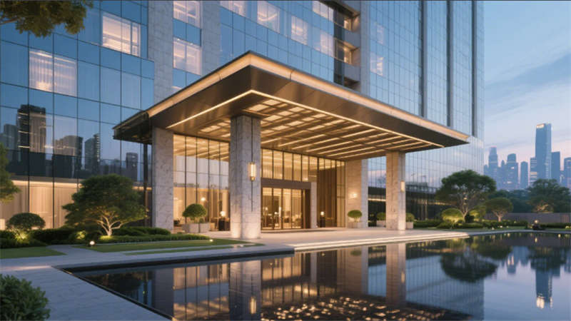 外觀設計以玻璃幕墻與天然石材的幾何拼接為視覺焦點,日景通過景觀水池倒映建筑輪廓,夜晚則依托泛光照明凸顯立體層次,與城市天際線和諧共生。挑空兩層的大堂以金色流線吊燈與懸浮水晶樹藝術裝置為核心,大理石地面與弧形LED背光接待臺營造沉浸式抵達體驗,自然光與暖色燈光交織,傳遞低調奢華氣質。