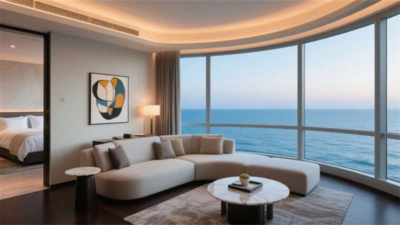客房區域強調“靜謐中的科技感”,標準間通過木飾面隱藏燈帶與霧化玻璃衛浴實現功能與美學的平衡;全景套房則以180度落地窗引入自然景觀,臨窗圓形浴缸與雙臺盆設計重新定義奢華體驗。