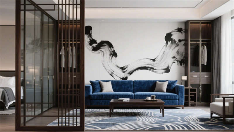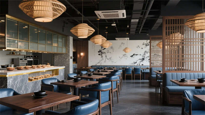 步入大堂,深胡桃木墻面與淺灰石材地面構成經典東方底色,水墨藝術玻璃屏風似山巒疊嶂,懸浮竹編吊燈以編織肌理軟化空間。靛藍色沙發與黃銅細節的點綴,既延續外立面色彩邏輯,又激活視覺層次。餐飲空間延續木格柵語言,竹編燈罩與黑陶器皿在開放式廚房的金屬框架中碰撞,演繹“新舊共生”的餐飲儀式。