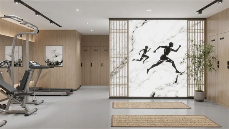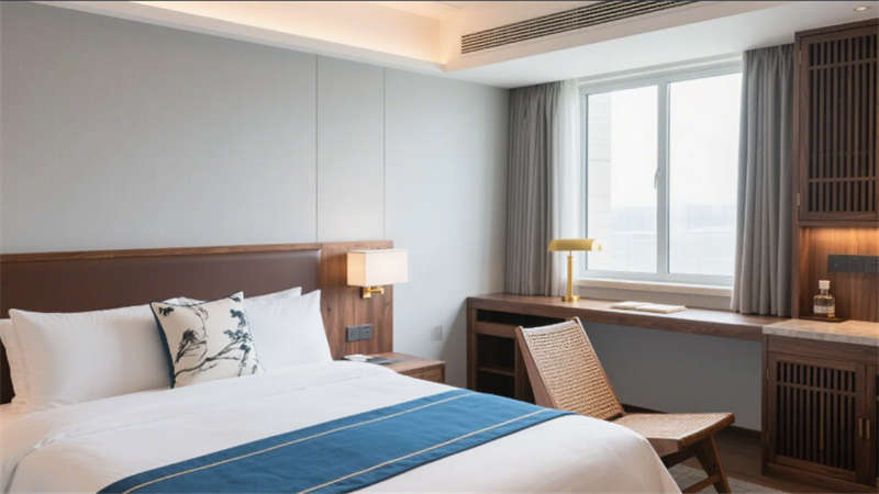 客房區域以“去符號化”手法詮釋東方美學:深木紋床頭背板嵌入隱晦的水墨紋樣,藤編躺椅與迷你吧木格柵柜體,在3000K暖光中營造居停的松弛感。套房通過絲絨沙發與抽象水墨畫提升奢華調性,浴缸區的竹藝卷簾巧妙平衡通透與私密。公共空間亦貫徹統一語匯——健身房竹編地墊與水墨運動壁畫、走廊絹絲燈箱與枯山水景墻,皆以現代材質轉譯傳統元素。