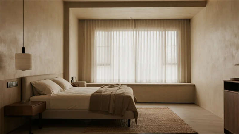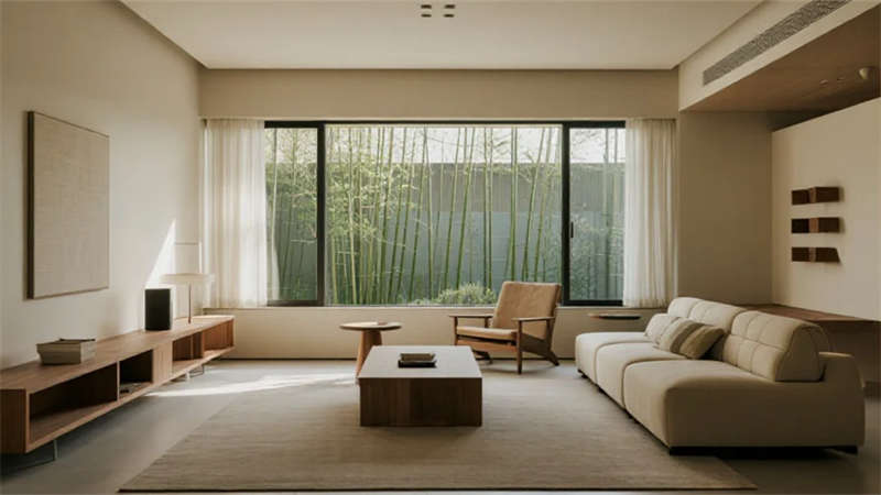 空間布局強調流動性與光影互動,落地窗成為連接內外的畫框,將庭院竹影、城市天際線轉化為動態藝術裝置。無主燈設計搭配隱藏式照明系統,在夜間暈染出柔和的光韻層次。衛浴空間以灰調水磨石營造靜謐感,獨立浴缸臨窗而設,沐浴時可見星月交輝。