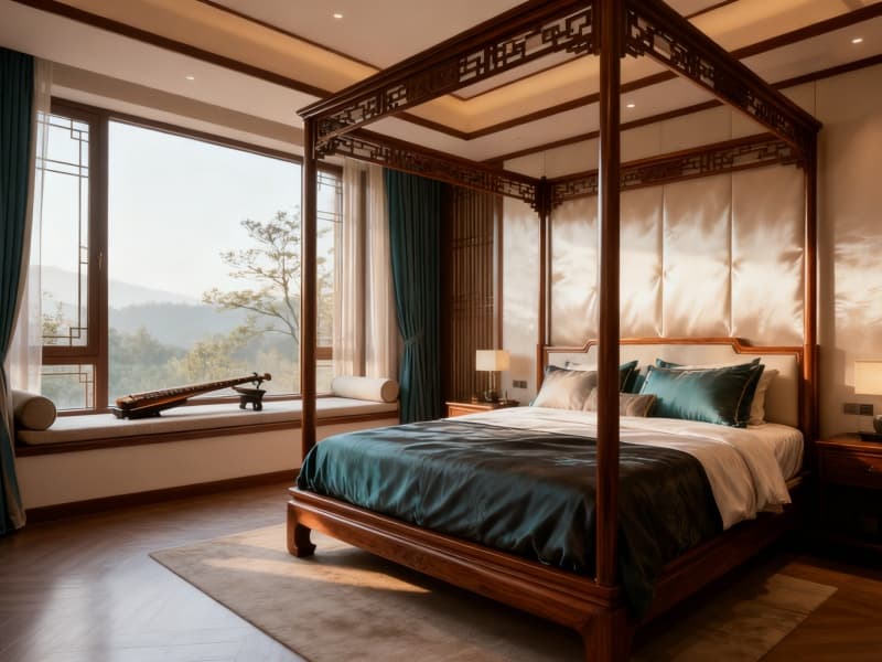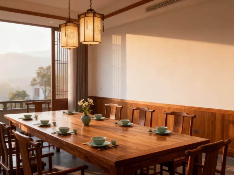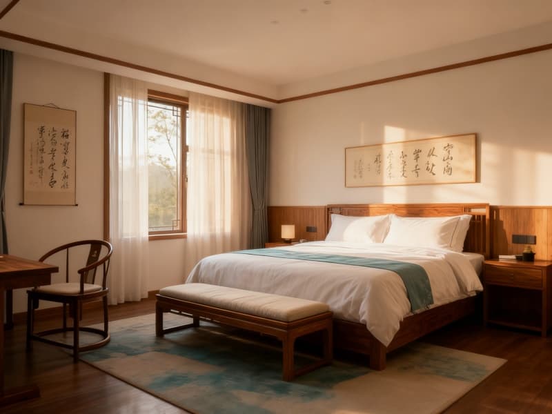室內(nèi)空間借由廣角鏡頭可感知的通透布局,讓原木紋理成為空間的重要語言。公共區(qū)域的桌椅、隔斷均選用帶有自然木紋的實(shí)木材質(zhì),搭配淺色系軟裝,清晨的光線透過窗欞灑入,在木紋上形成柔和的光影,增添空間的層次感。客房設(shè)計(jì)注重細(xì)節(jié),床頭背景墻以簡約的中式紋樣點(diǎn)綴,床品選用素雅色調(diào),與原木家具呼應(yīng),營造出安穩(wěn)休憩的氛圍。?