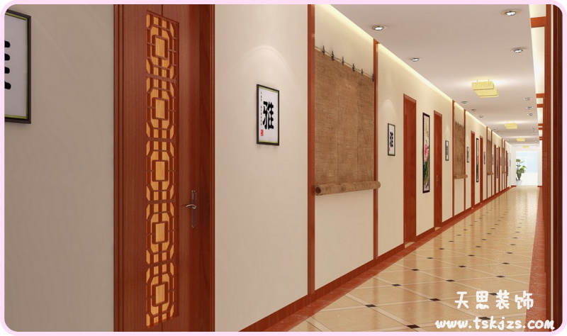 走廊是室內流通空間的主要部分,其空間特點是狹長,且缺少變化,人在這種空間中容易產生單調感。因此,在設計上應做一定的藝術處理。使其既不能過于華麗、復雜,也不宜過于簡單、呆板、應在墻壁上做一定的裝飾點綴。如做出口線、偏倚柱、外門套和墻壁裝飾線條的藝術處理,以及字畫或燈光的點綴。在特殊功能區的路段,可以做色彩變化或不同的裝飾處理,從而形成 統一中有變化的視覺效果。在通常情況下,走廊的設計要求是:應有充足的光照度、統一和諧的界面裝飾,清新淡雅的色調和明確的導向指示。