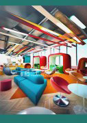 辦公室裝修主題色彩設(shè)計(jì),辦公室設(shè)計(jì)主題就是色彩,長長的彩條作為照明器具縱橫于天花板上,彌補(bǔ)了大面積裸露天花板的空缺,家具色彩的搭配和長長的彩條相呼應(yīng),整個辦公空間色彩鮮