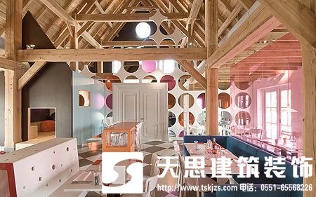 餐廳的建筑特色是一個由龐大的木梁搭成的農(nóng)場屋頂。在餐廳設(shè)計空間中,我們試看通過鋪設(shè)家具和一些在物體、家具或空間本身之間形成的交叉元素來創(chuàng)造一個生動有趣的世界。比如,將一張桌子變成一個窗戶、一輛巴士或者一個廚房。中央位置六米高的結(jié)構(gòu)看起來像一圈抽象的云霧,五顏六色,同時又與手工搭成的精美建鋪物形成和諧對比。