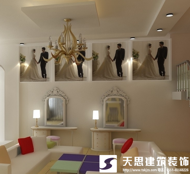 中小型影樓裝修利用鏡面成像的原理,可成倍地增加長(zhǎng)度、寬度和深度。在影樓店面裝修中若將一面墻裝上鏡子,那么就會(huì)使人感到房間擴(kuò)大了一倍。如果將鏡面安在天花板與墻壁的交接處,可以模糊界線,從而擴(kuò)展空間。影樓燈光照明設(shè)計(jì)通常與店面的色彩搭配選擇。