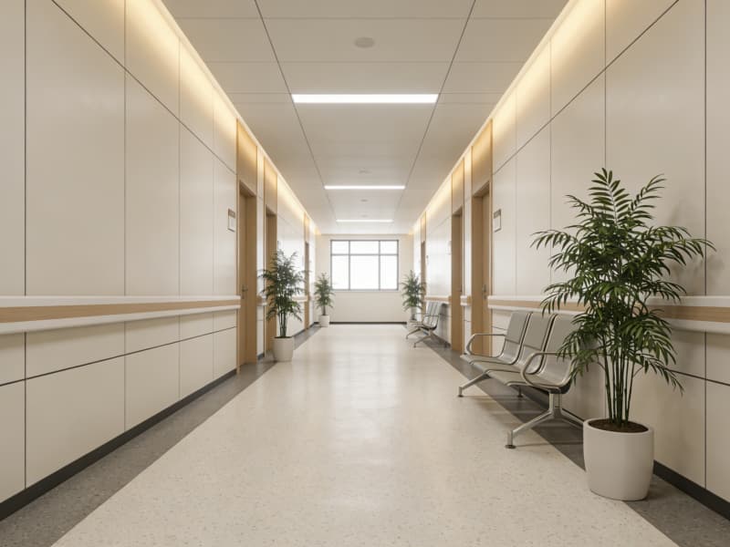 門診大廳以淺木色與純凈白為基調(diào),挑高空間搭配懸浮式吊頂,自然光透過大面積落地窗灑入,與室內(nèi)精心布置的景觀綠植呼應(yīng),消解患者的緊張感。分診臺采用弧形設(shè)計,圓角處理的臺面與溫潤的材質(zhì)傳遞出細(xì)膩關(guān)懷。