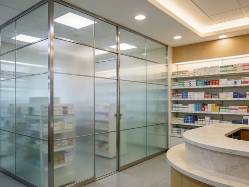 藥房采用半通透的玻璃隔斷,內(nèi)部陳設(shè)整齊有序,取藥臺高度貼合人體工學(xué),溫和的燈光讓藥品陳列既清晰又不刺眼。