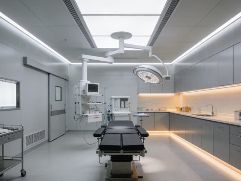 手術(shù)室區(qū)域以潔凈的灰白色為主,搭配暗藏式燈帶與防菌墻面,動線設(shè)計清晰流暢,確保高效運(yùn)作的同時,通過局部的暖光點綴弱化冰冷感。