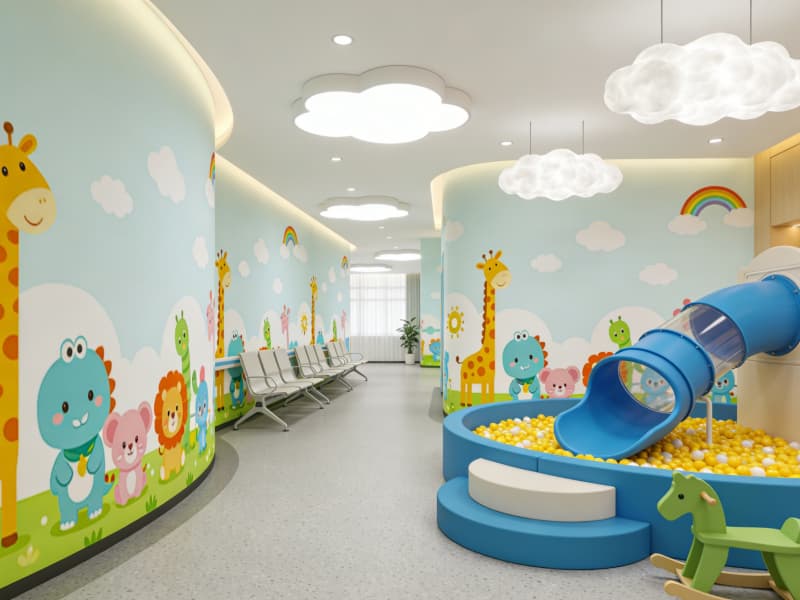 兒科專區(qū)則融入柔和的弧線與低飽和的馬卡龍色調(diào),墻面繪制童趣圖案,候診區(qū)設(shè)置小型游樂角,用輕松氛圍緩解孩童對就醫(yī)的恐懼。整個空間在保障醫(yī)療功能的同時,讓自然與人文關(guān)懷貫穿始終。
